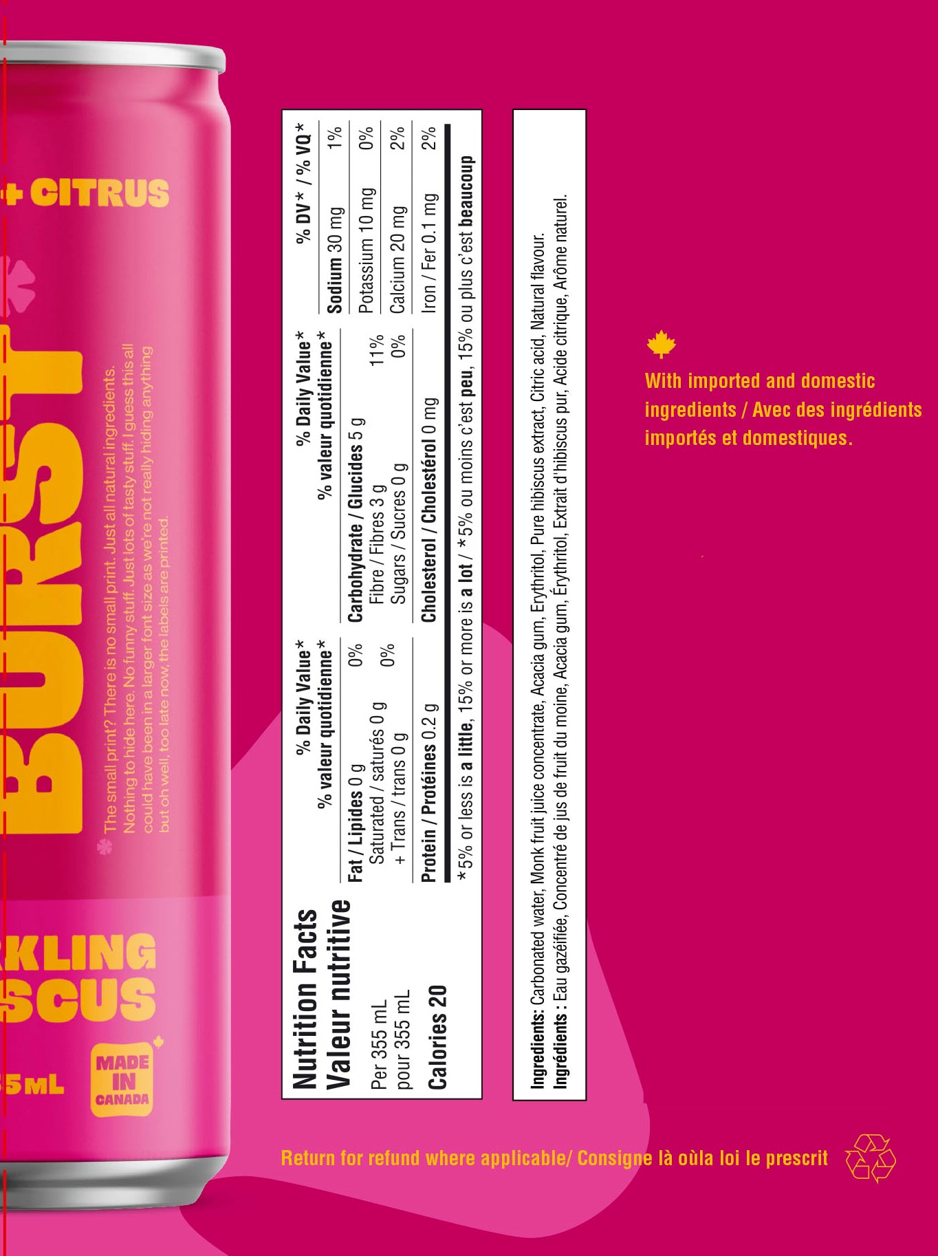 Carbonated water, Monk fruit juice concentrate, Acacia gum, Erythritol, Pure hibiscus extract, Citric acid, Natural flavour.